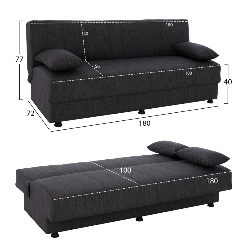 3-местен разтегателен диван със сив плат, който става на легло, когато облегалката му "падне". Размери: 193x82x81H см.