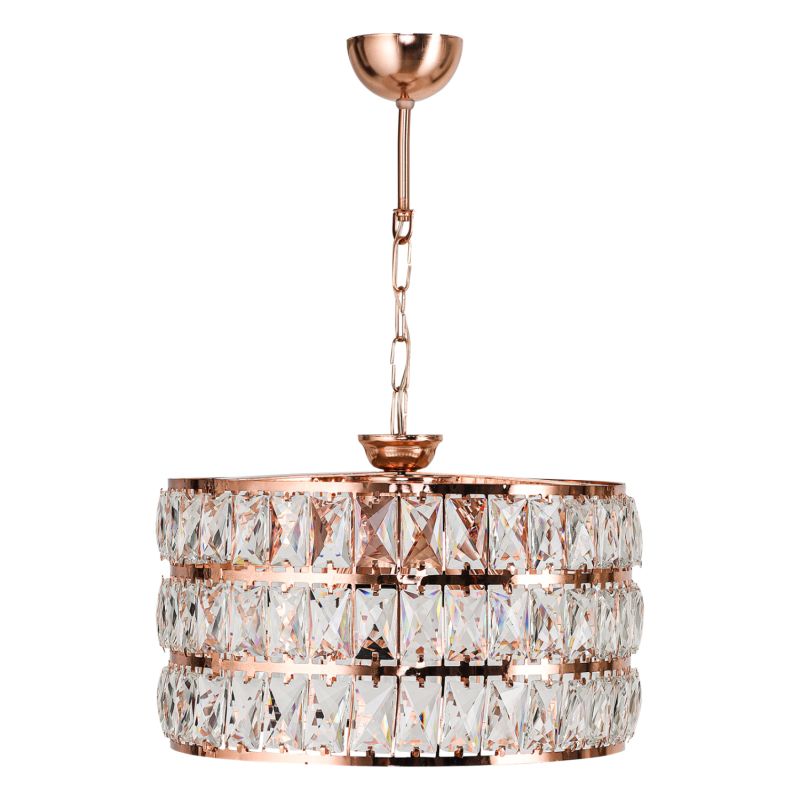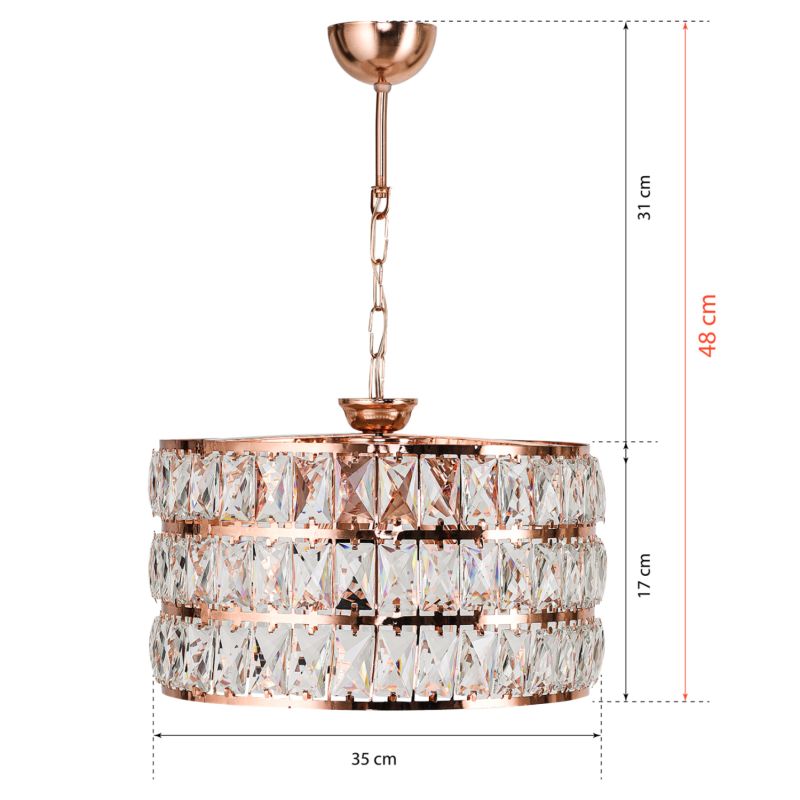 Hm7663.01- Висулка за таван-----Независимо дали е ден или нощ, включено или изключено, тази висулка със стъклена "капачка" дава на вашето пространство мигновено надграждане на стила. Светлината се разпръсква силно в пространството благодарение на стъклото, което я подсилва, а цялата композиция придава усещане за лукс със своята основа от РОЗОВО ЗЛАТО и висяща верига от РОЗОВО ЗЛАТО.