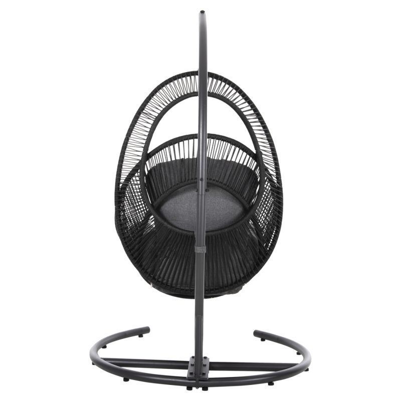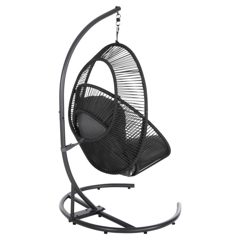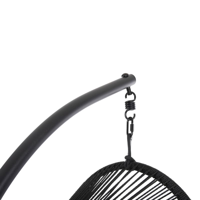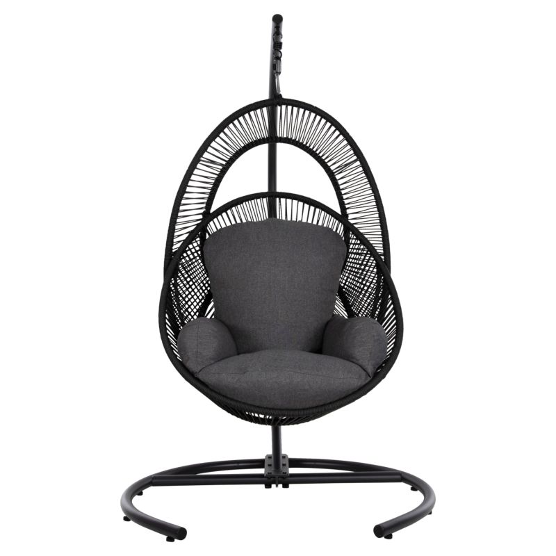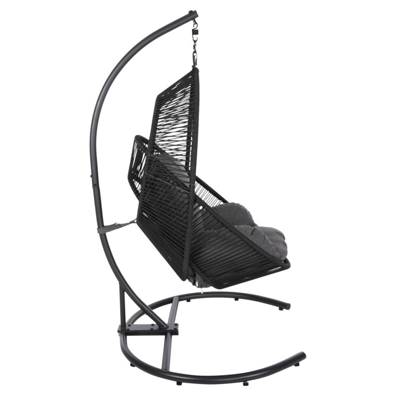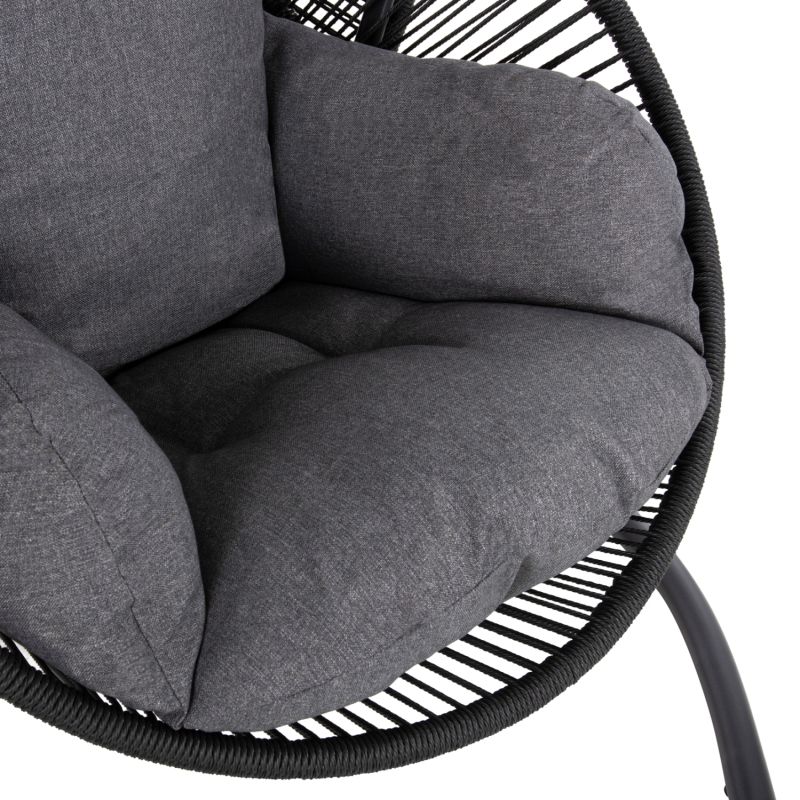 Единичното висящо гнездо RULER се отличава в своя клас. През цялото време хамаците са олицетворение на безгрижието и релаксацията. Предлагаме ви този хамак в стил висящо гнездо като голямо кресло, изработен от синтетичен усукан ратан (усукан да изглежда като въже) в ЧЕРЕН цвят със СИВИ удобни възглавници! Висящата рамка на хамака-гнездо е изработена от ЧЕРЕН подсилен метал и хамакът се окачва с верига от една точка за окачване. Това гнездо може да се използва както за домашна, така и за бизнес употреба.