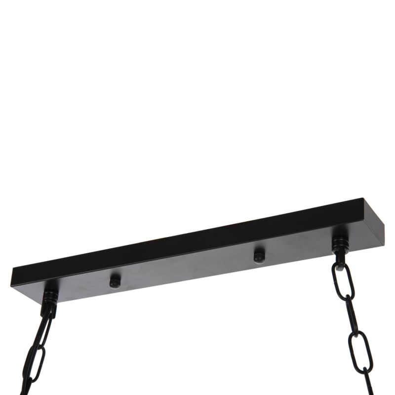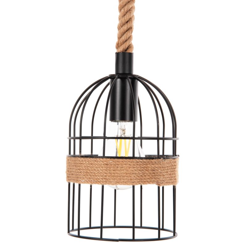 Оставете светлината да се разпространи в пространството с оригинално и елегантно висящо осветително тяло за таван, завършвайки вашата декорация. Тази 3 лампа виси от метална основа на тавана с вериги, които държат черна метална тръба. 3-те светлини в красиви капачки висят на тази тръба с въже.