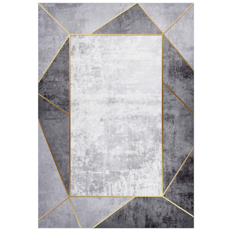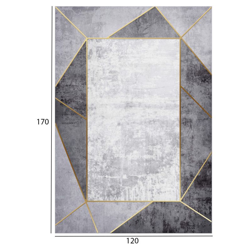 Този модерен килим е с доминиращи цветове бяло, сиво в два тона и златно в линиите. Неговата забележителна характеристика е белият правоъгълник в центъра на килима, който прилича на огледало в златна рамка. Модерен килим, който ще грабне окото и ще надгради естетически вашата всекидневна.