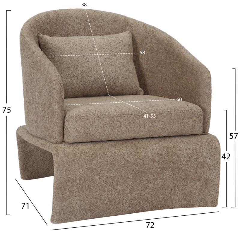Вътрешен фотьойл BEVY в БЕЖОВ цвят е модерен и красив. Характеристиката, която отличава това кресло е, че седалката с полукръгла облегалка и удобни възглавници лежи върху основа с подобна естетика. Фотьойл, който никога няма да остане незабелязан.