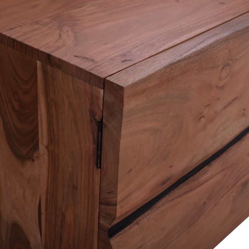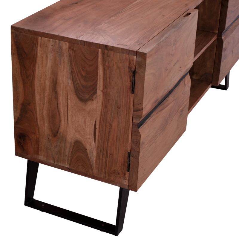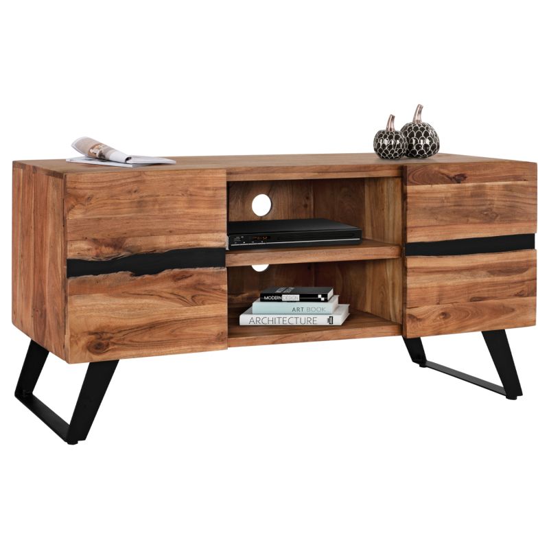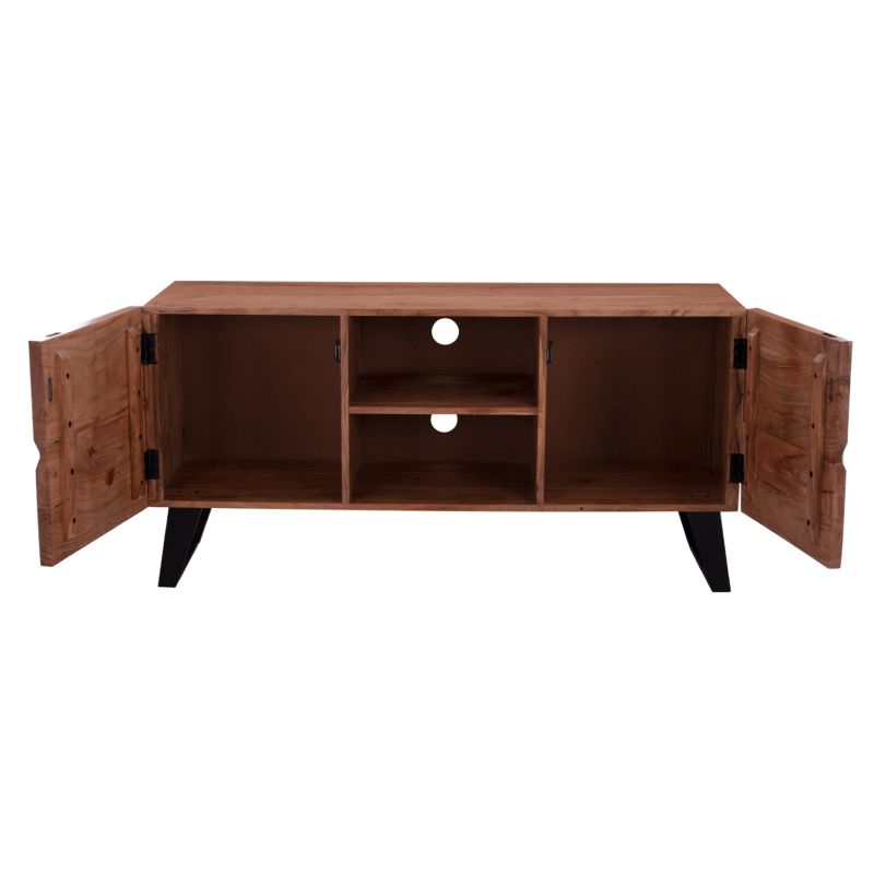ТВ мебел от масивно акациево дърво в естествен цвят и метални крака в черен цвят.