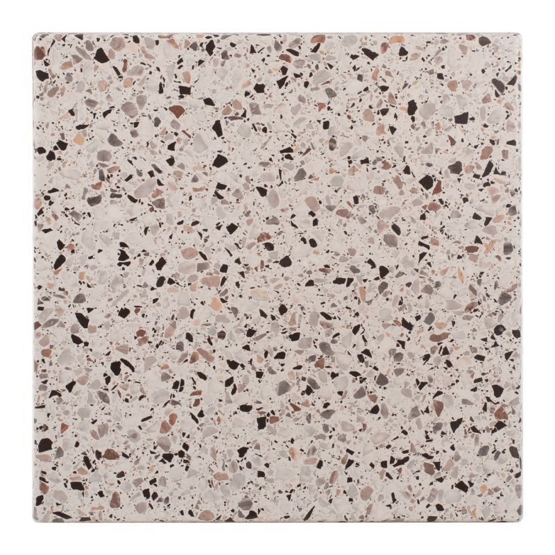 Професионален плот за маса SQUARE в цветова гама TERRAZZO (като мозайка), който е подходящ за контакт с храни. Като цяло материалът е екологичен. Може да се използва в кафенета, ресторанти и туристически места за настаняване, на закрито или на открито.