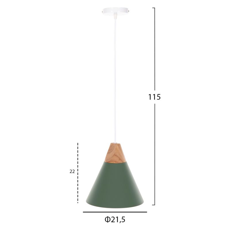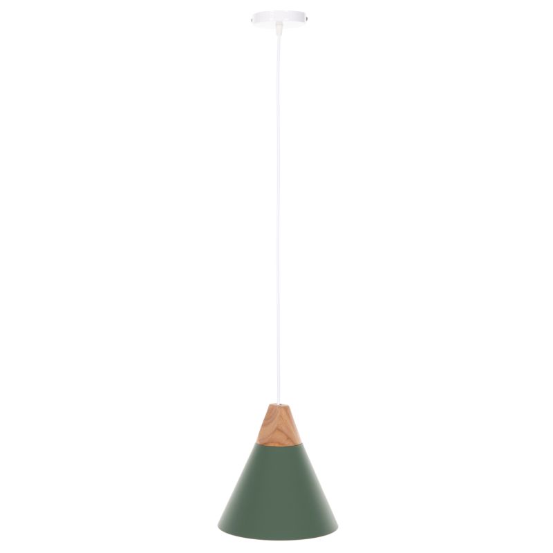 Открийте нашата нова висяща таванна лампа и завършете декорацията си. Това е лампа със ЗЕЛЕНА метална капачка във формата на камбана с дървени детайли в горната част на лампата. Естетически, той е завършен с бял висящ кабел и бяла таванна основа и е най-новата тенденция при плафониери.