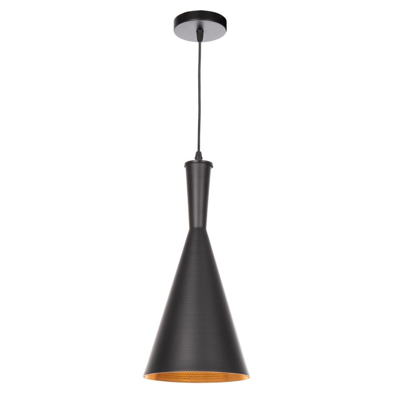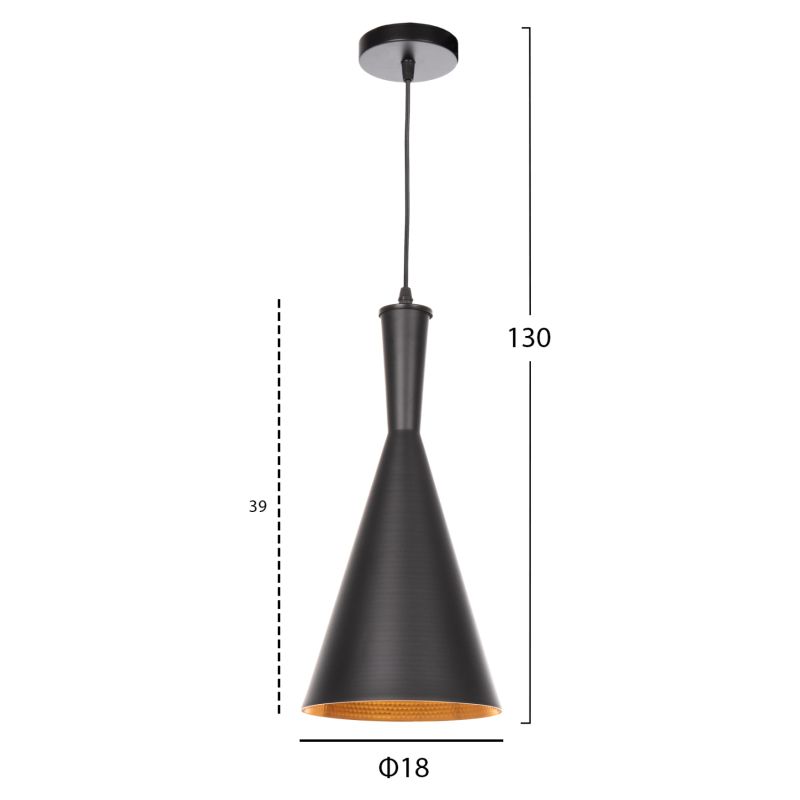 Открийте нашата нова висяща таванна лампа и завършете декорацията си. Това е лампа с ЧЕРНА продълговата АЛУМИНИЕВА капачка със златиста повърхност от вътрешната страна на лампата.