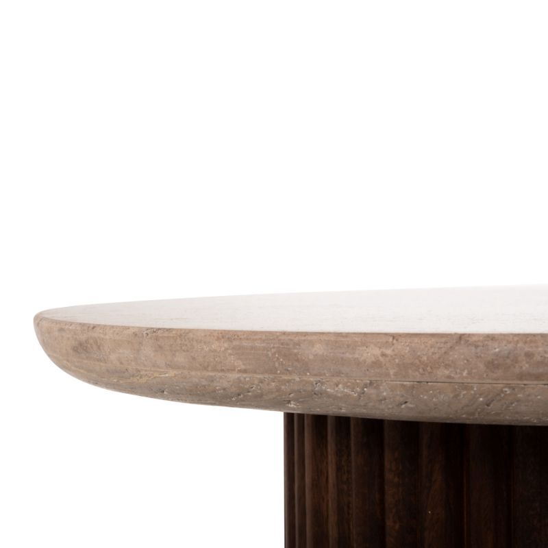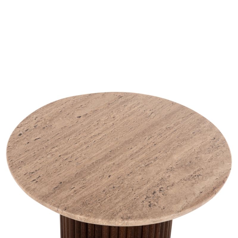 GLADYS е кръгла холна маса за хол в КАФЯВ цвят с плот от травертин в БЯЛ цвят. Това е луксозна и практична мебел за вашия хол, която няма да остане незабелязана!