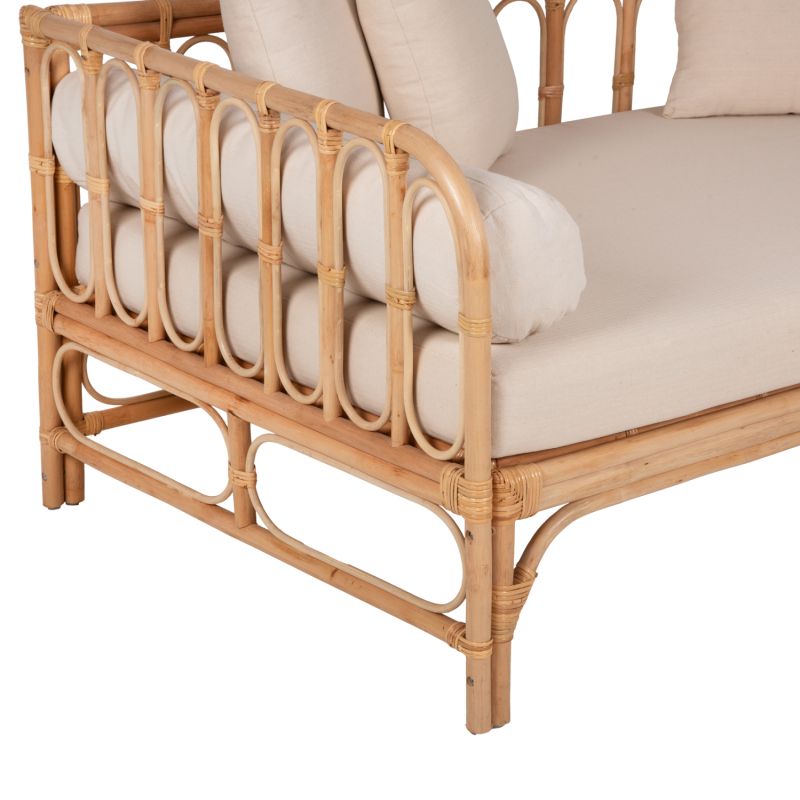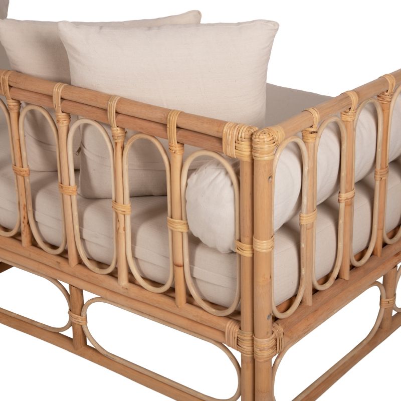 Диванът е изработен от естествен ратан. Ратанът е най-добрият и използван естествен материал за различни конструкции. Ратанът, отглеждан в Югоизточна Азия, е най-висококачественият и издръжлив материал от подобните, отглеждани в други региони. С повече от 600 различни вида РАТАНА може да се разграничи като силно влакнесто растение, подобно на бамбука и широко използвано, защото е леко, издръжливо, гъвкаво и привлекателно.