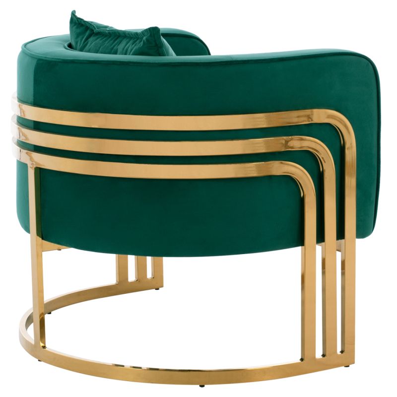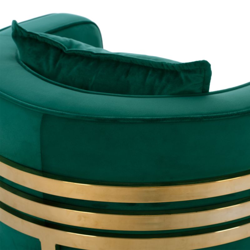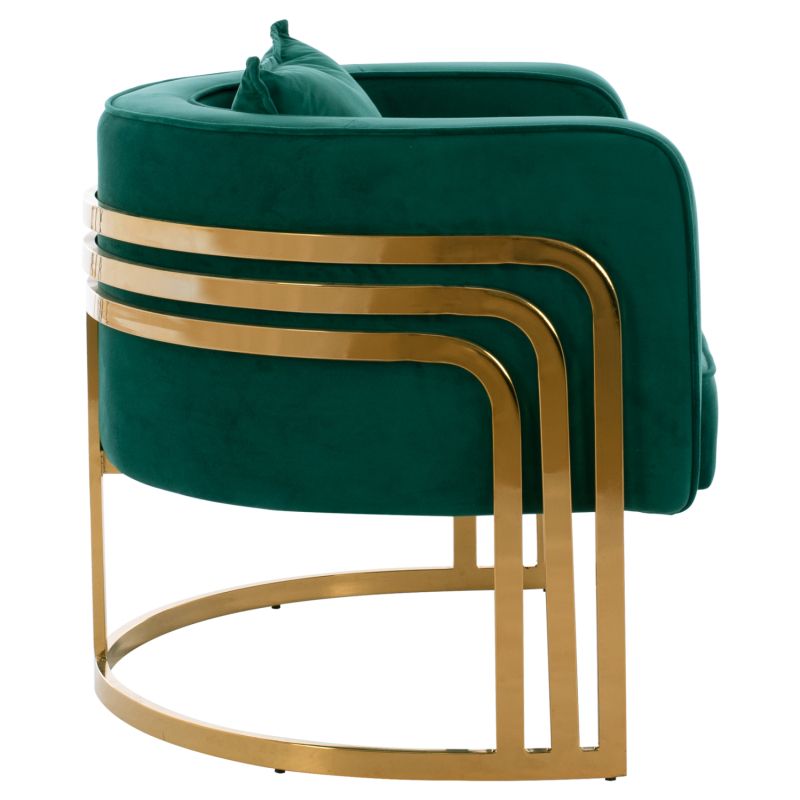 Кресло TIANA е красиво кресло в кипарис зелен цвят и метална конструкция в златист цвят. Рамката завършва с краката на фотьойла, които са в полукръгла основа с 3 вертикални пръта върху металния полукръг. Стол, който придава нещо специално на всяко бизнес пространство. Отличителен, качествен и елегантен, той определено ще привлече окото. Облегалката е ниска, но се предлага с мека възглавница, докато целият фотьойл има кадифена подплата и отличителна шевна релса, което добавя към специалния характер на това кресло.