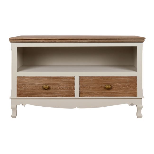 Модерна стойка за телевизор в кремав/кафяв цвят. Има 2 чекмеджета и един рафт за съхранение на вашите електрически уреди.