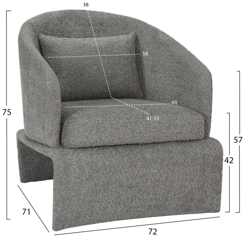 Вътрешен фотьойл BEVY в СИВ цвят е модерен и красив. Характеристиката, която отличава това кресло е, че седалката с полукръгла облегалка и удобни възглавници лежи върху основа с подобна естетика. Фотьойл, който никога няма да остане незабелязан.