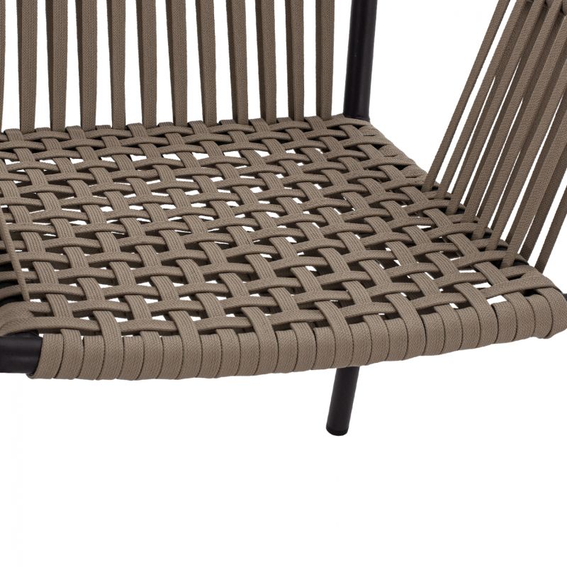 Модерно кресло, изработено от алуминиева конструкция в цвят въглен, обшито с плетена пе широка корда в облегалката в цвят капучино.