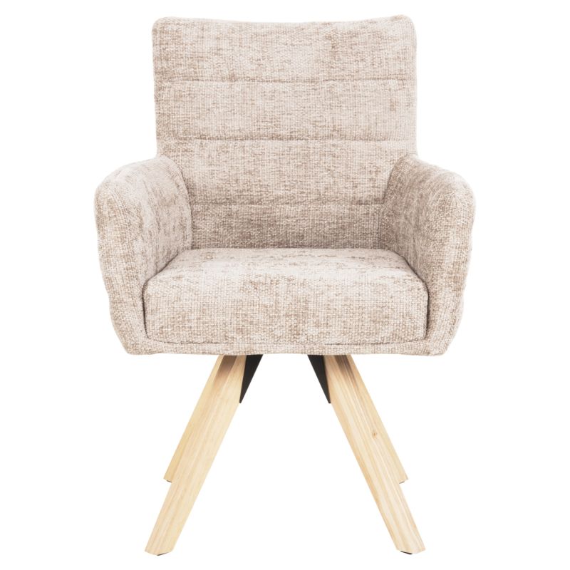 Трапезното кресло GAZER е още едно ново попълнение в нашата гама. Облегалката е със средна височина, а седалката е удобна. Подплатата е изработена изцяло от качествена дамаска в БЕЖОВ цвят, като лежи върху основа с 4 крака от каучуково дърво в НАТУРАЛЕН цвят.