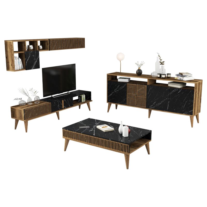 Композицията ΗΜ11845.02 ще промени облика на вашия хол и ще ви предложи подобрението, което винаги сте искали. Състои се от комбинация от мебели за вашия телевизор с подов модул и стенни рафтове, холна маса и бюфет. Цялата композиция е от същата серия, като доминиращите цветове са ОРЕХ и ЧЕРЕН МРАМОР.