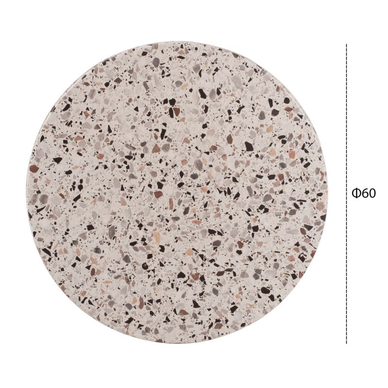 Професионален КРЪГЛ плот в цвят TERAZZO (това е като мозайка), който е подходящ за контакт с храни. Като цяло материалът е екологичен. Може да се използва в кафенета, ресторанти и туристически места за настаняване, на закрито или на открито.