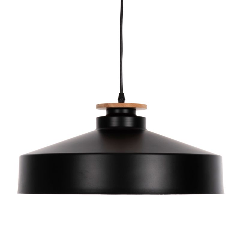 Открийте нашата нова висяща таванна лампа и завършете декорацията си. Това е лампа с ЧЕРНА плитка метална капачка във формата на камбана с дървени детайли в горната част на лампата. Естетически, той е завършен с черен висящ кабел и бяла таванна основа и е най-новата тенденция при плафониери.