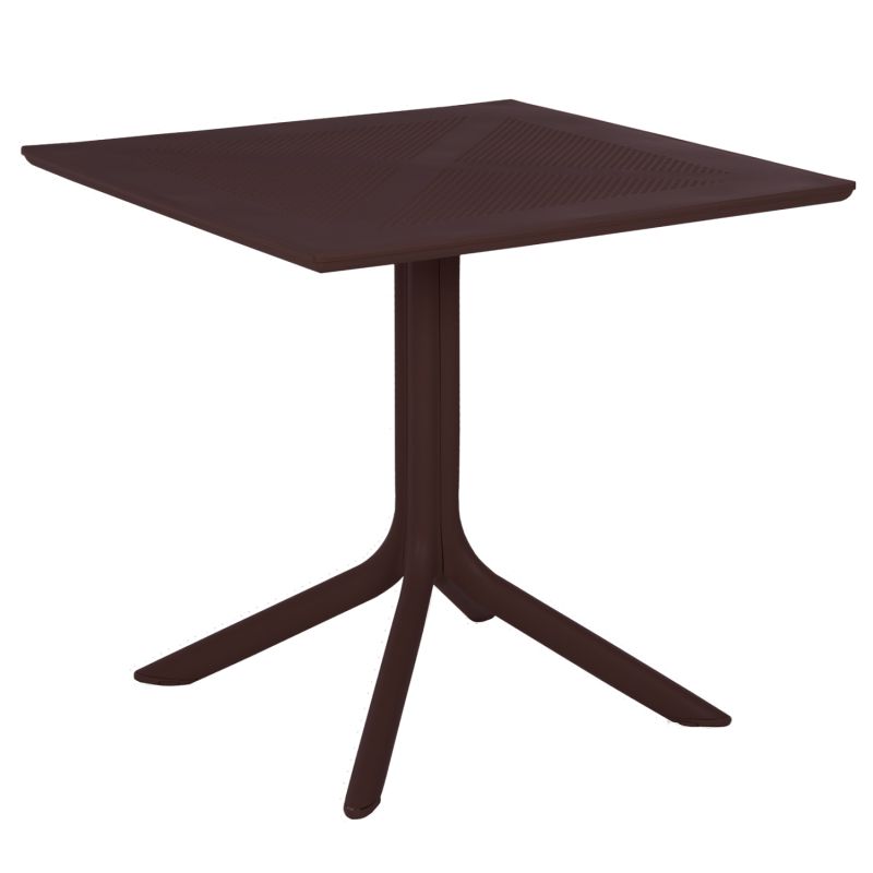 Полипропиленова маса КАФЯВ цвят. Идеално предложение за използване във външни пространства, независимо дали професионални (банкетни зали, кетъринг компании и др.) или за дома. Масата се състои от "перфориран" квадратен плот, докато опората се осигурява от колона в центъра, завършваща с 4 крака.