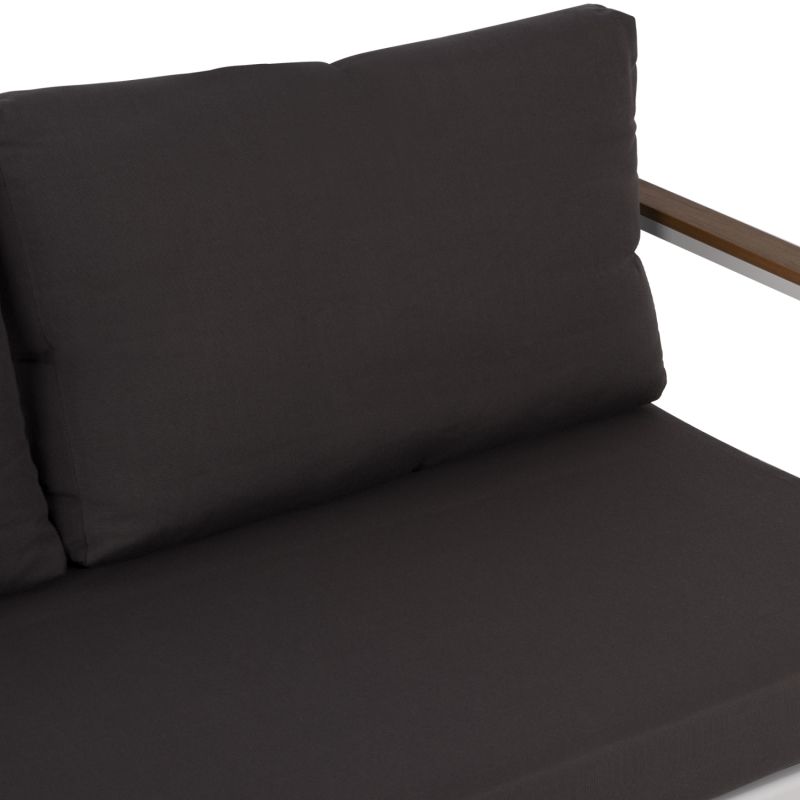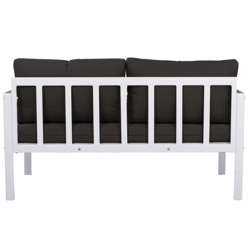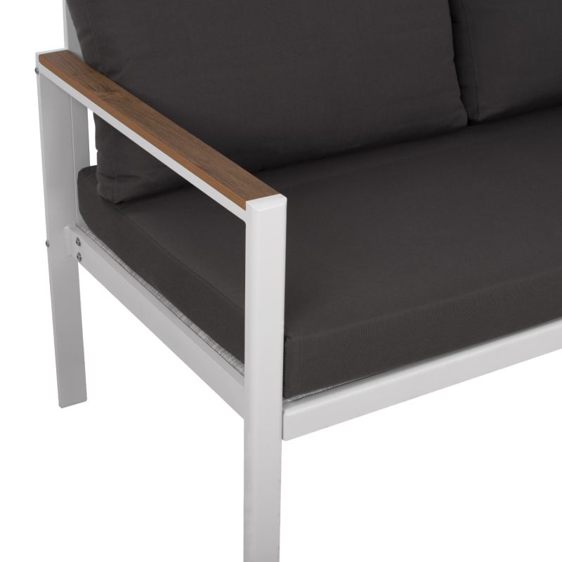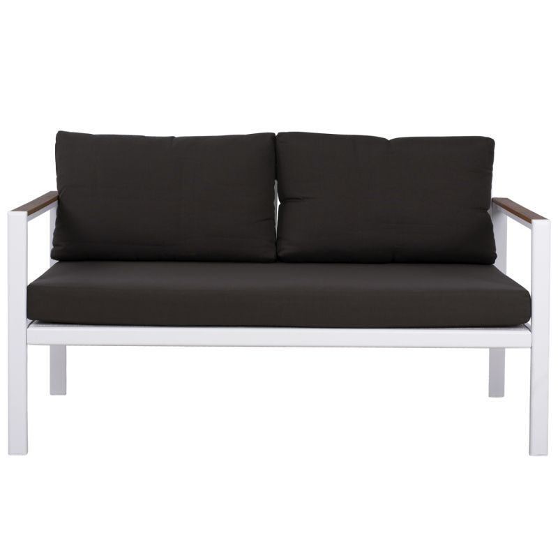 Двуместен диван от алуминиева конструкция в бял цвят и детайли от полидърво на подлакътниците и