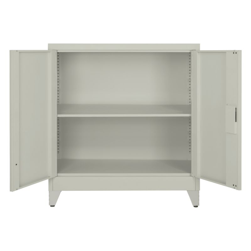DURON е практичен къс метален шкаф с крака, който е направен с оглед на капацитета за размера си и издръжливостта. Тя е двукрила, като двете врати се затварят точно в средата на конструкцията, а интериорът е едно пространство без вертикални прегради. Има 2 рафта, които създават 3 места за съхранение. Вратите са с ключалка, която се заключва с ключ, а цветът на гардероба е много светло сив.
