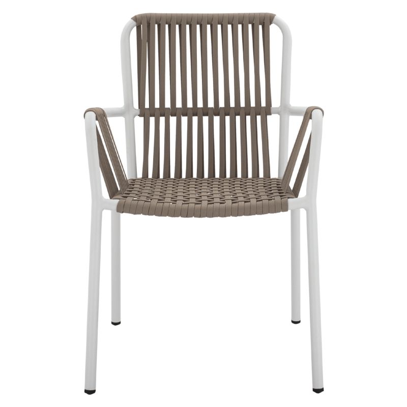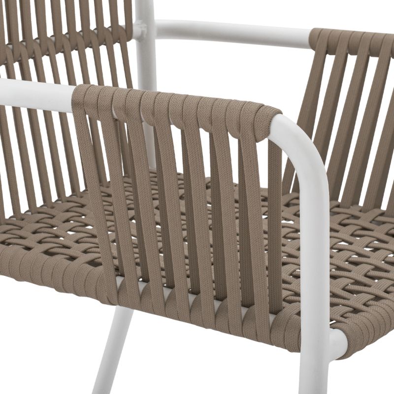 Модерно кресло, изработено от алуминиева конструкция в бял нюанс, обшито с плетена пе широка корда в облегалката в цвят капучино.