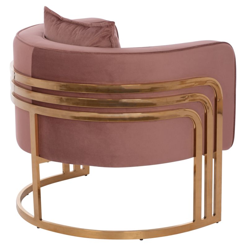 Кресло TIANA е красиво кресло в прашен розов цвят и метална конструкция в цвят злато. Рамката завършва с краката на фотьойла, които са в полукръгла основа с 3 вертикални пръта върху металния полукръг. Стол, който придава нещо специално на всяко бизнес пространство. Отличителен, качествен и елегантен, той определено ще привлече окото. Облегалката е ниска, но се предлага с мека възглавница, докато целият фотьойл има кадифена подплата и отличителна шевна релса, което добавя към специалния характер на това кресло.
