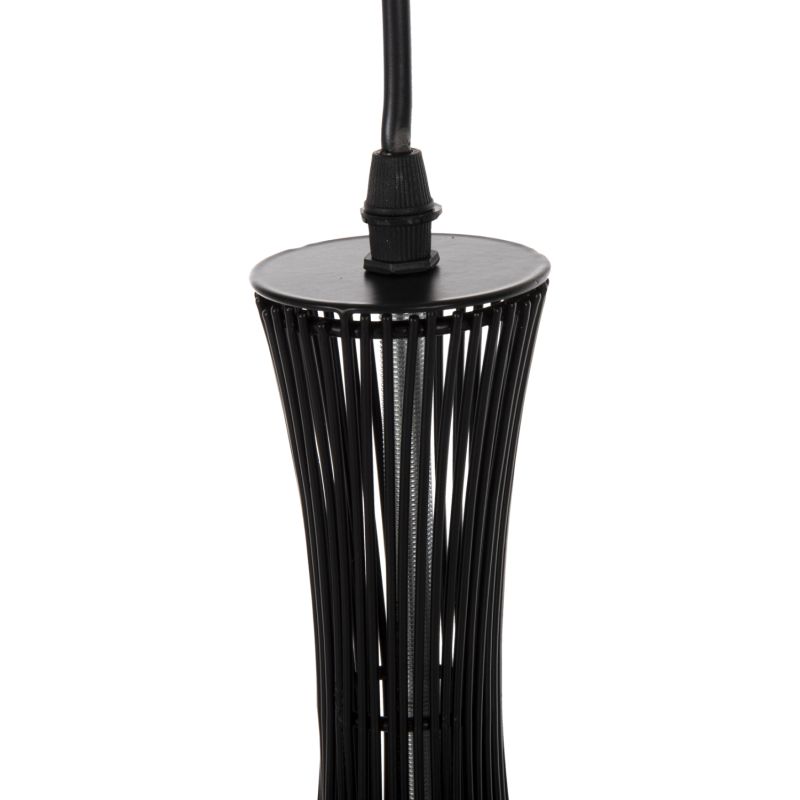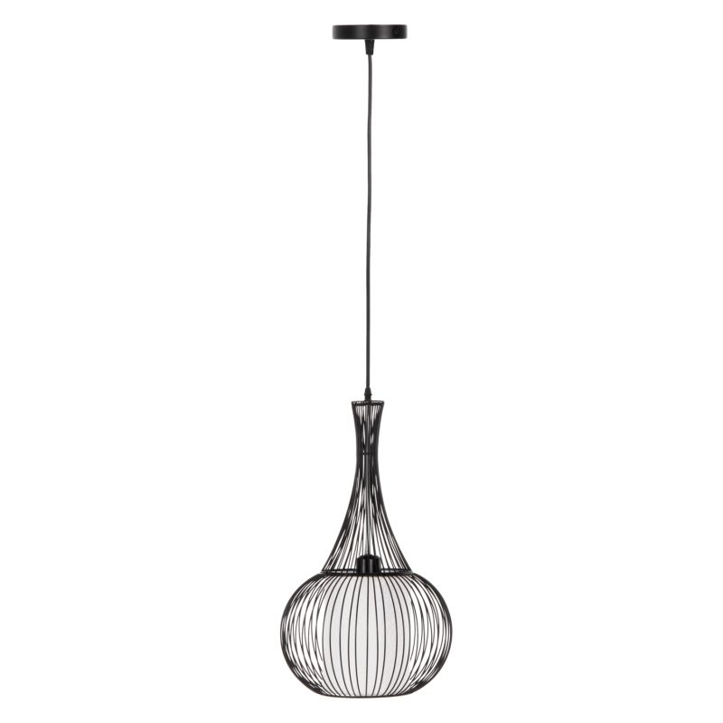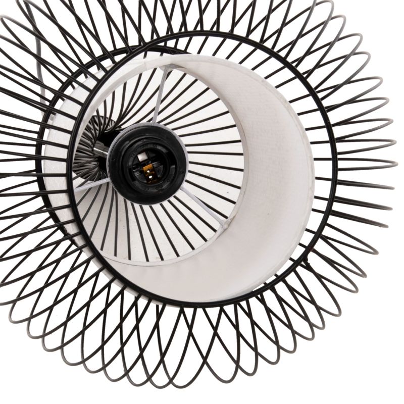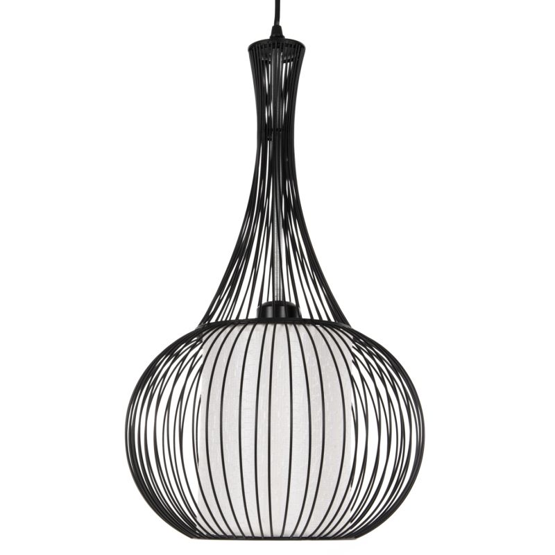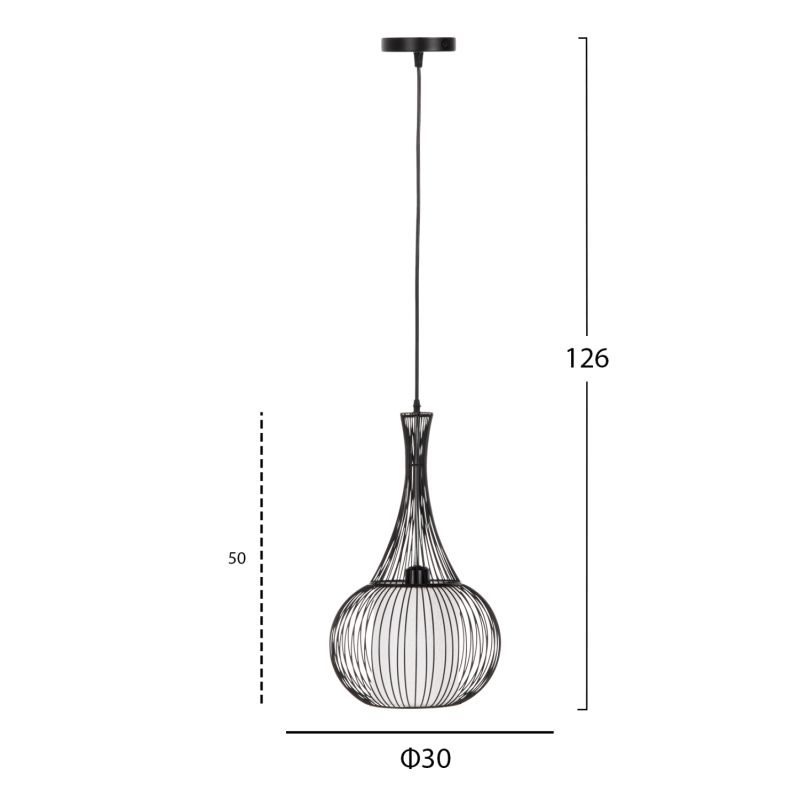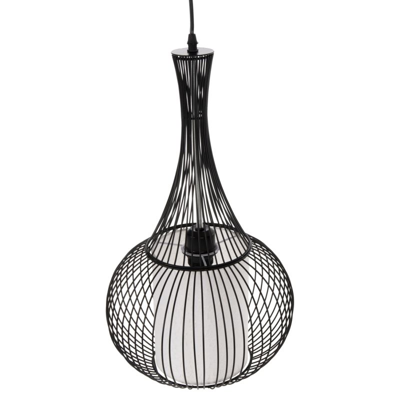 HΜ4132--- Запознайте се с новата, оригинална и елегантна висяща лампа за таван в нашата гама и завършете своята декорация. Има ЧЕРНА метална капачка в дизайн на широка бутилка, докато лампата е вътре в бял PVC плат, който подчертава яркостта, но в същото време не пречи на светлината да достигне до всеки ъгъл и е олицетворение на модерния дизайн при плафониери.