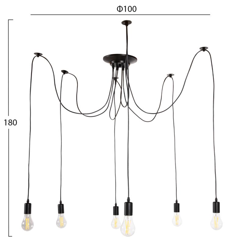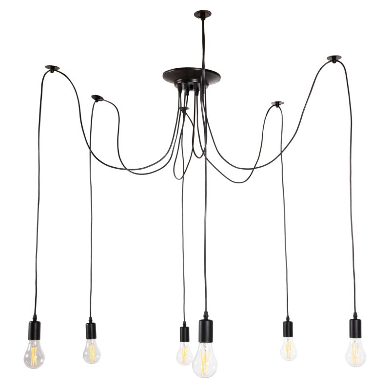 Многосветлият HM4175 е още едно допълнение към нашата гама. Има черна метална стойка за таван с 6 дълги черни кабела, които завършват с 6 черни фасунги за крушки. Тези кабели могат да бъдат окачени по различни начини от тавана, придавайки ваш собствен стил на пространството. Тази буйна многофункционална лампа ще освети големи пространства с много светлина и ще впечатли със своята простота.