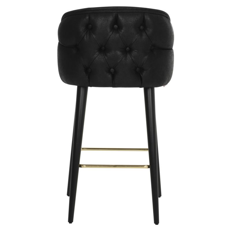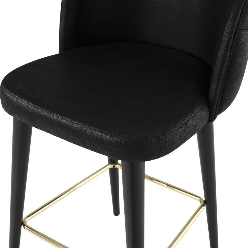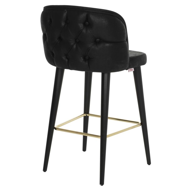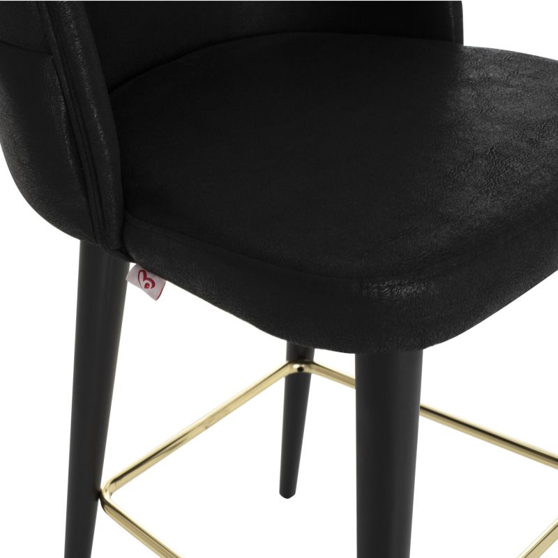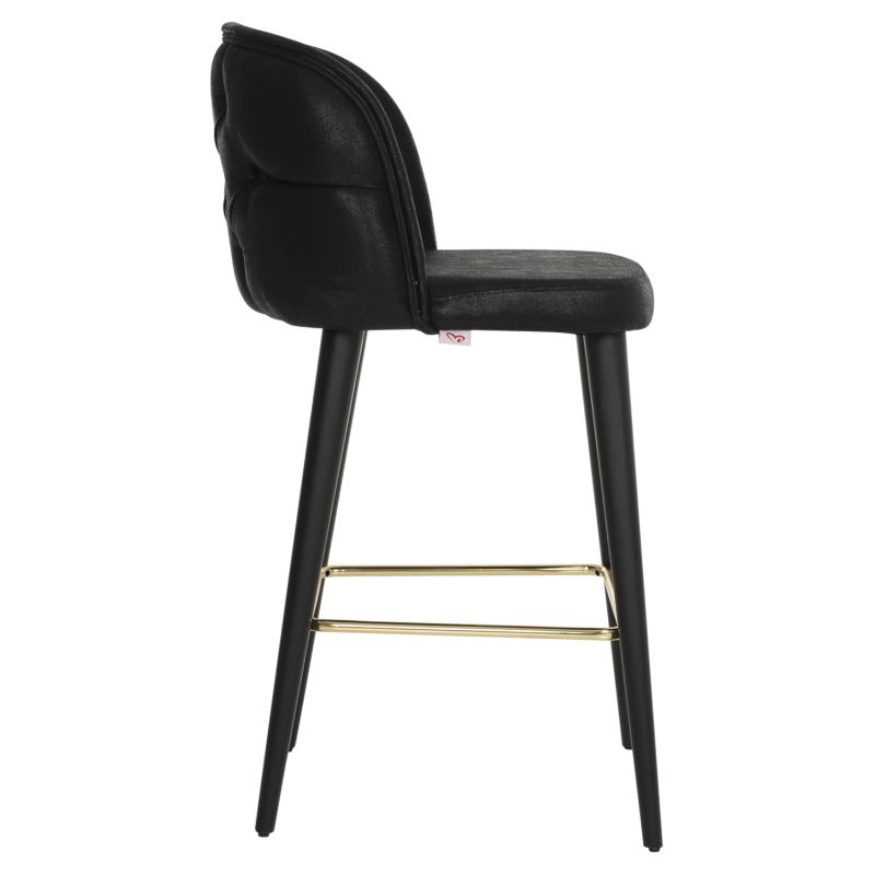Професионален бар стол "MARCELLO" в ЧЕРЕН цвят с черни дървени крака. Краката са съединени в средата с метална правоъгълна шина в златист цвят. "MARCELLO" е семпъл, качествен и елегантен на външен вид и определено грабва окото със своята материя тип НАБУК. Висок е с къс гръб. Задната част на облегалката на табуретката е капитонирана, което засилва нейния специален характер.