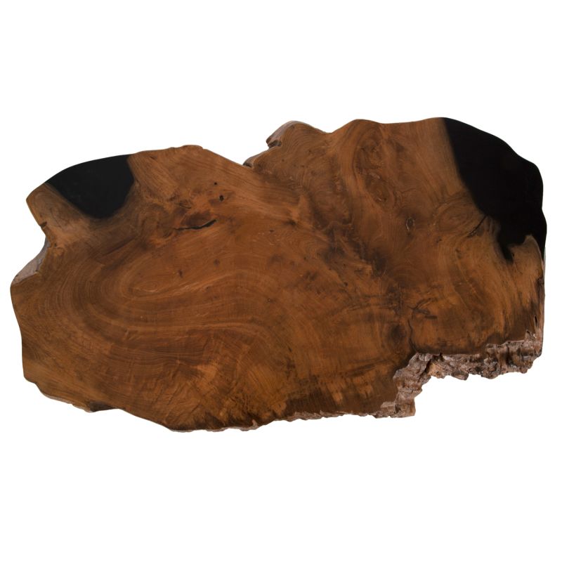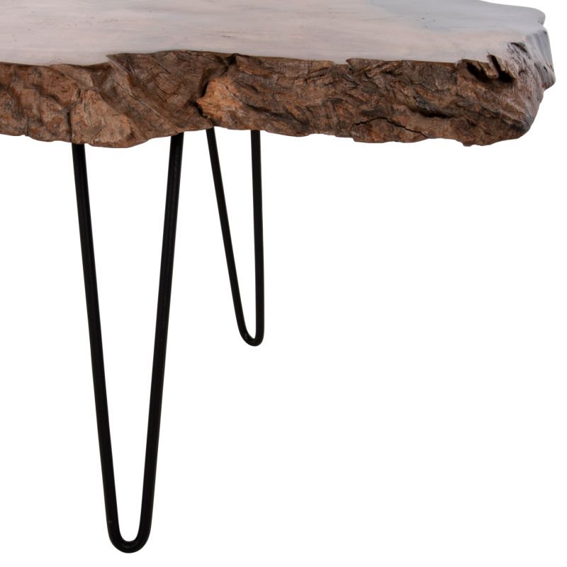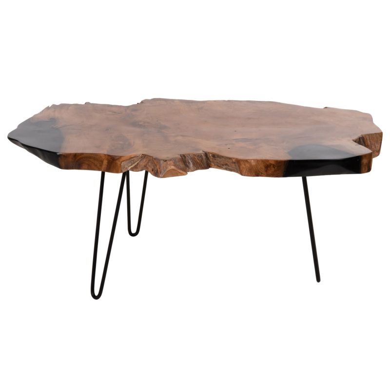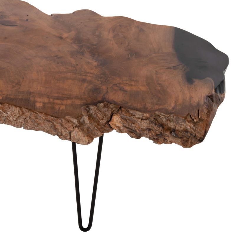 GLAZE е холна маса, изработена от масивно естествено дърво, което запазва неправилната си форма. Тази повърхност е покрита със специален смолист лак, докато има черни метални крака. Съществуващите пукнатини или тези, които могат да се образуват с течение на времето се дължат на свиването-разширяването на живия организъм, наречен масивна дървесина, а не са производствен дефект, придавайки оригиналност и уникален дизайн на вашето пространство. Това не са дефект на продукта. Идеален както за професионални места, така и за вашия дом.