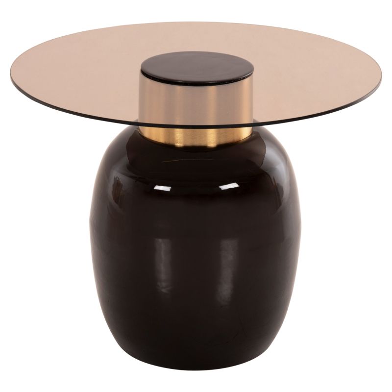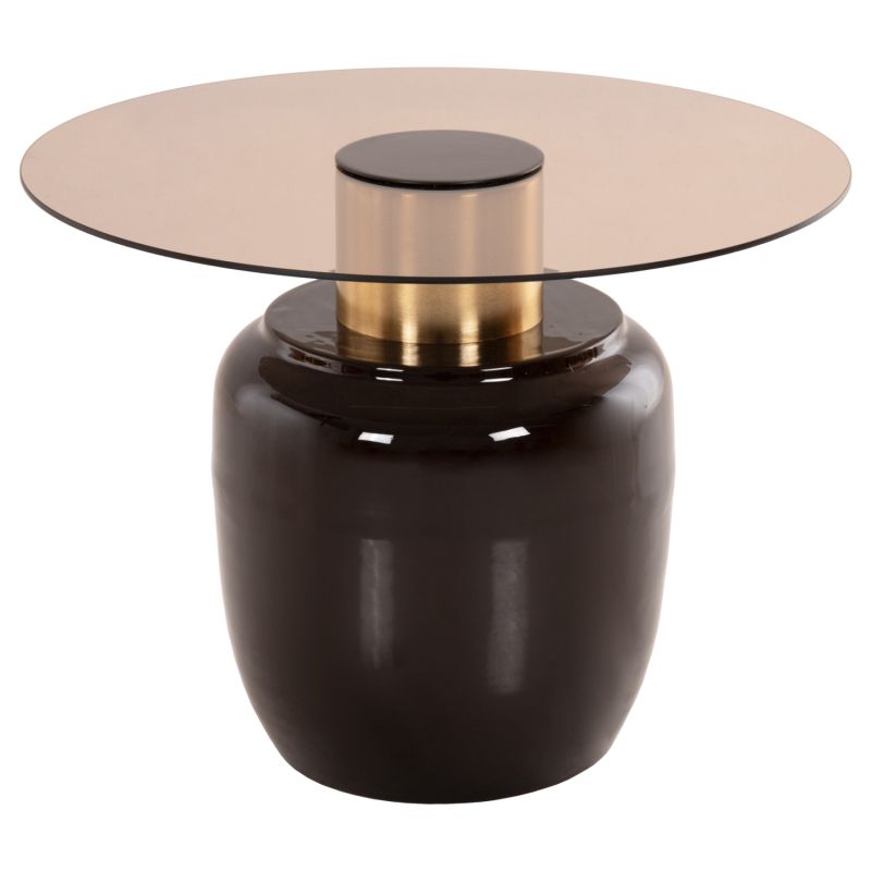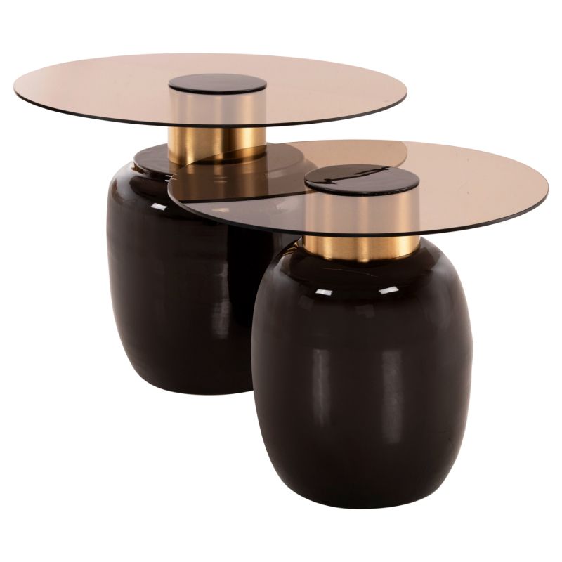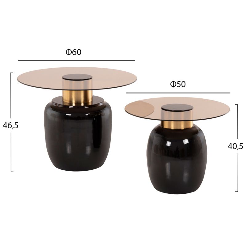 Комплектът помощни маси FRYN от 2 е едно от новите попълнения в нашата гама. Това са 2 кръгли маси с цилиндрична основа, изработени от метал. Цветът им е КАФЯВ, а “шията” е в златист цвят. Плотовете са изработени от светлокафяво тонирано стъкло. Изключителната характеристика на тези маси са лъскавите повърхности, които придават усещане за чистота и лукс на вашия хол. Идеален както за дома, така и за бизнес помещения.