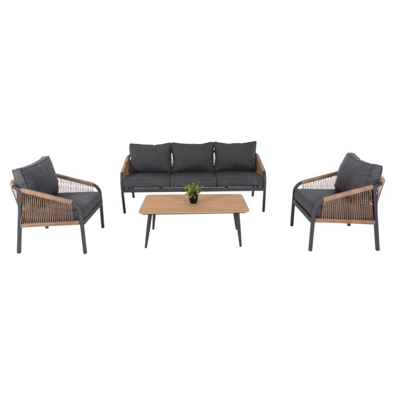 Представяме ви ефектната и нова външна холна гарнитура “MAERLY” в цвят АНТРАЦИТ, с холна маса, 2 фотьойла и 1 тройка. Комплект, който ще обикнете от пръв поглед. Рамката на целия комплект е алуминиева, покрита със синтетично въже в БЕЖОВ цвят. Техният дизайн е красив за гледане, докато тяхната здравина е очевидна. Седалката на дивана и фотьойлите е широка, а облегалката им обгръща тялото, което повишава комфорта, който предлагат, съчетан с удобните възглавници както на седалката, така и на облегалката. Триместният диван в подобен дизайн обаче е най-впечатляващата част от този комплект с големите си размери, които го правят отправна точка. Възглавниците в целия комплект са покрити с полиестерен плат в цвят АНТРАЦИТ и са с пълнеж от дунапрени със средна твърдост за възможно най-голям комфорт. Какво повече може да поиска някой, за да обнови екстериора на своя бизнес?