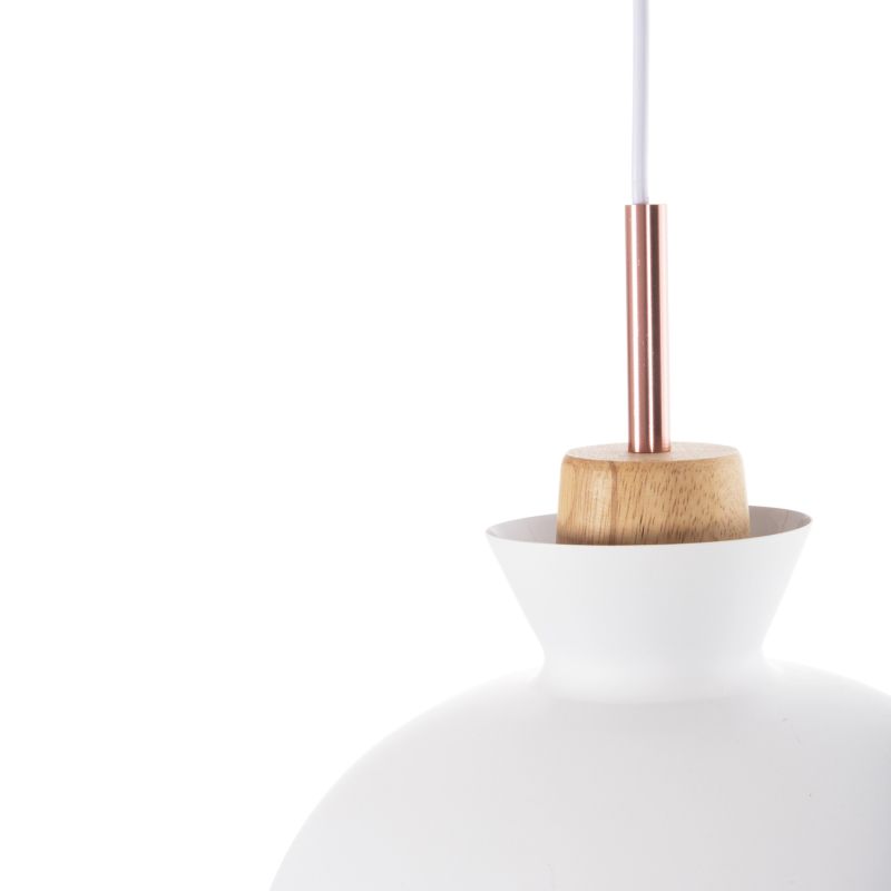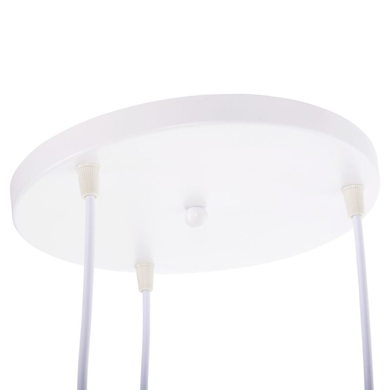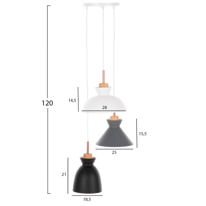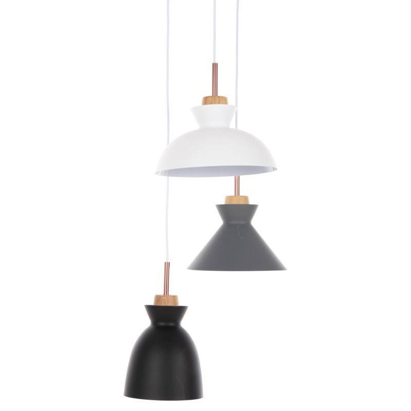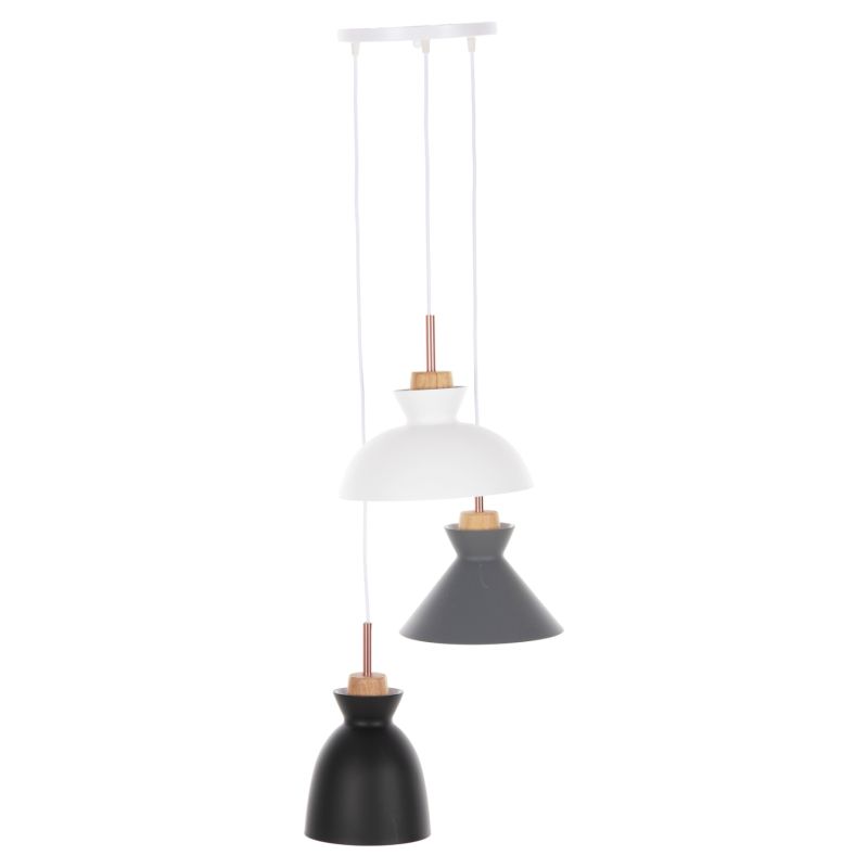 Открийте красивото осветително тяло за таван с 3 лампи HM4142. Приспособление, което ще допълни декорацията на всекидневната, благодарение на 3-те капачки с различна форма и цвят всяка. 3-те цвята (сиво-бяло-черно) са придружени от парче дърво, от което висят капачките и което стига до цокъла на лампата.