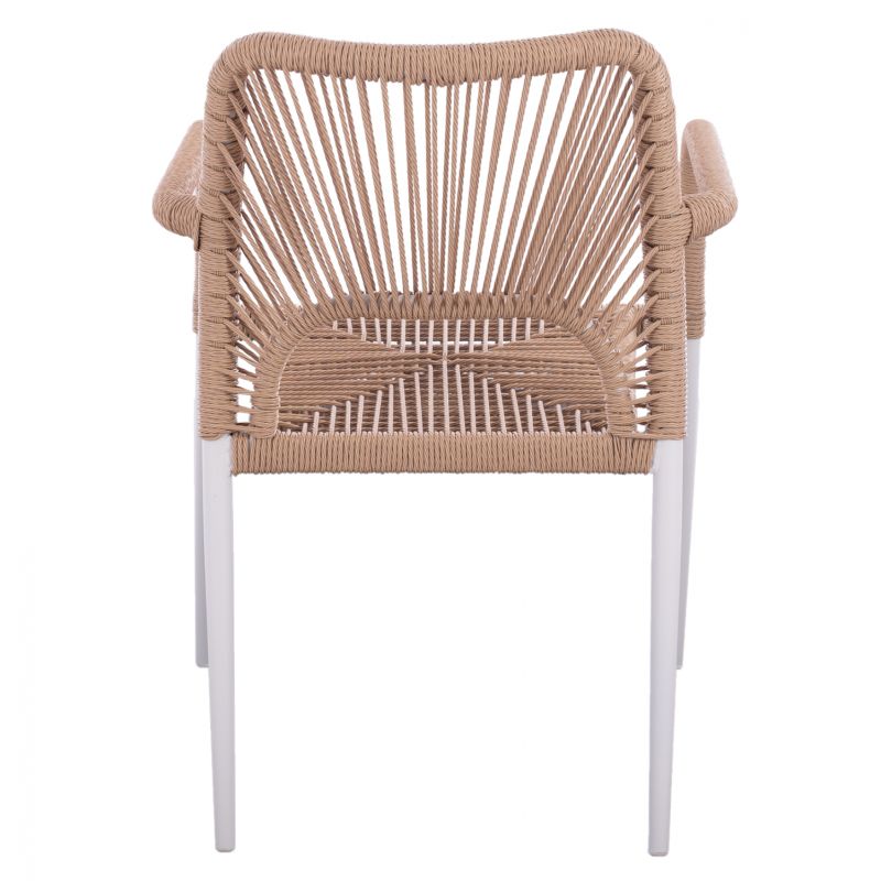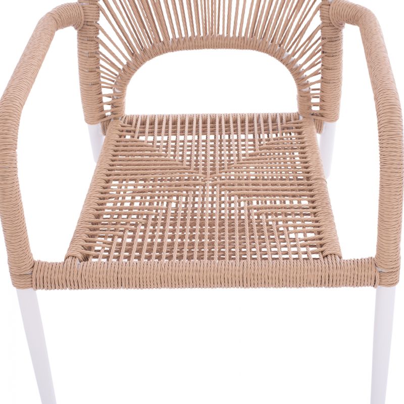 Модерно кресло, изработено от алуминиева конструкция в бяло, тапицирано с плетено подсилено PE въже на седалката и облегалката в бежов цвят.