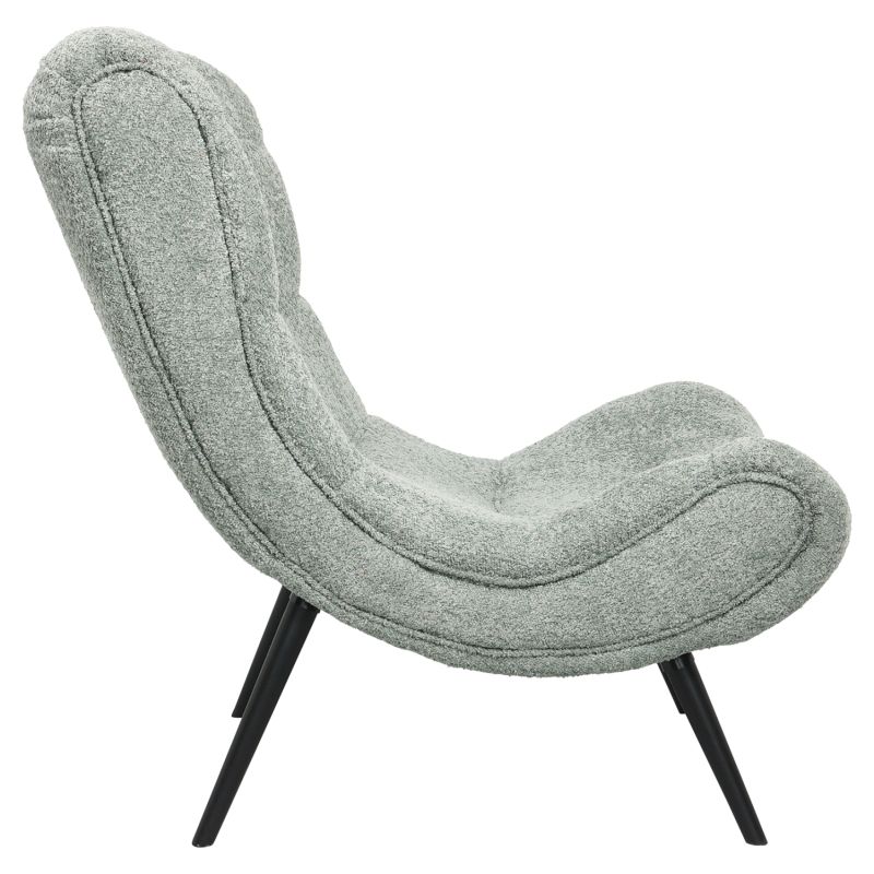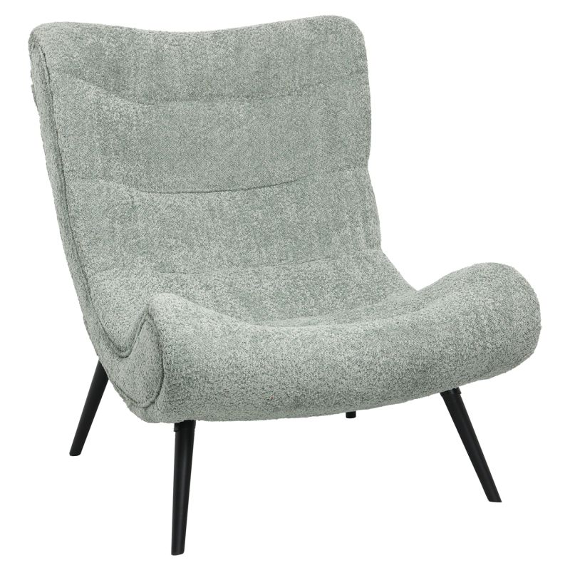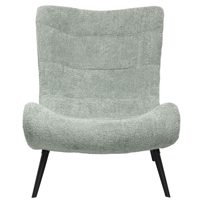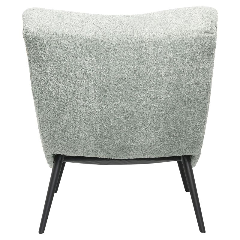 Това е креслото BRYM в цвят PISTACHIO GREEN с черни дървени крака. Няма подлакътници, а дизайнът му с постоянна облегалка и висока облегалка го прави изключително удобен. Подплатата от букле предлага топло усещане, което ще ви хареса!