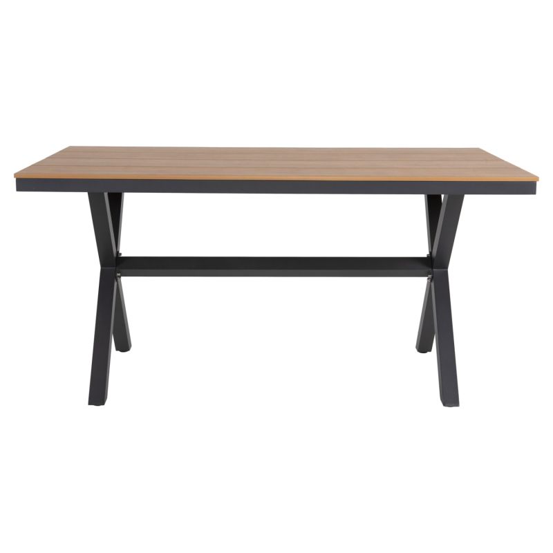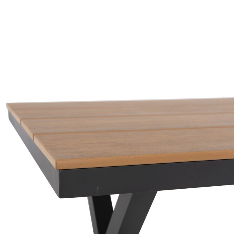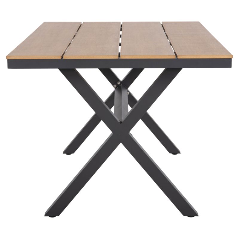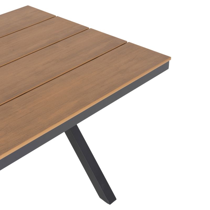 TAWNEE е правоъгълна външна маса с алуминиева рамка в кръстосани крака, свързани с хоризонтална алуминиева греда и е в цвят АНТРАЦИТ. Плотът е изработен от полидървесни плочи в НАТУРАЛЕН дървесен цвят. Това е красива маса в големи размери, която може да обслужи поне 6 души.
