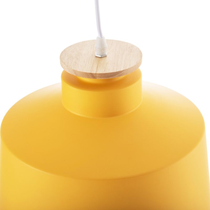 Открийте нашата нова висяща таванна лампа и завършете декорацията си. Това е лампа с ЖЪЛТА алуминиева капачка във формата на камбана с дървени детайли в горната част на лампата. Естетически, той е завършен с бял висящ кабел и бяла таванна основа и е най-новата тенденция при плафониери.