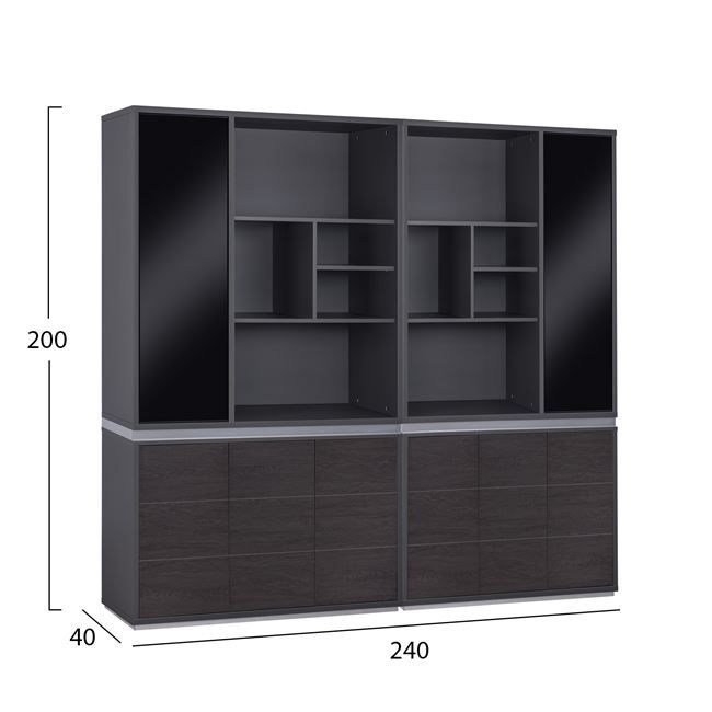 Разполага с шест шкафа с вътрешен рафт в долната част, два стъклени шкафа в горната част с по два вътрешни рафта и десет отворени места за съхранение.