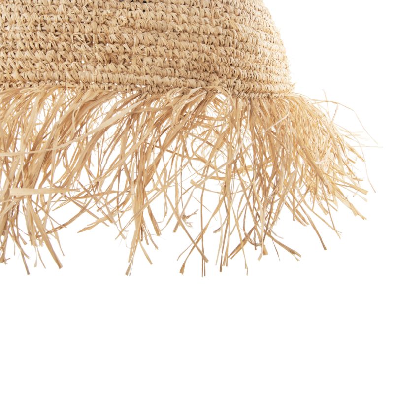Hm7855- Висулка за таван---- Ако искате да украсите вашето пространство с лампа в бохо стил с екзотични материали, това е типичен избор. Представлява единична лампа с капачка във формата на камбана от влакна на палмови листа с ресни, в НАТУРАЛЕН цвят. В горната част има и дръжка за окачване.