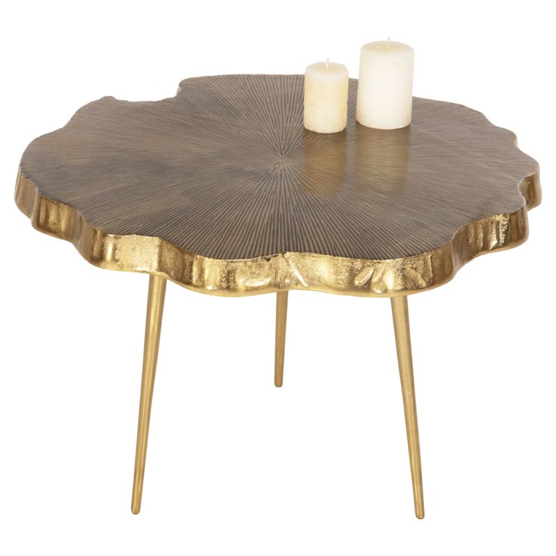 ANGUL е холна маса с 3 крака, изработена изцяло от метал в цвят ЗЛАТО и ЧЕРНО. Особеността на тази маса е, че тя симулира "парче" от ствол на дърво, поради което формата на повърхността й е неправилна. Това ново допълнение към нашата гама ще даде на вашето пространство напълно различен облик.