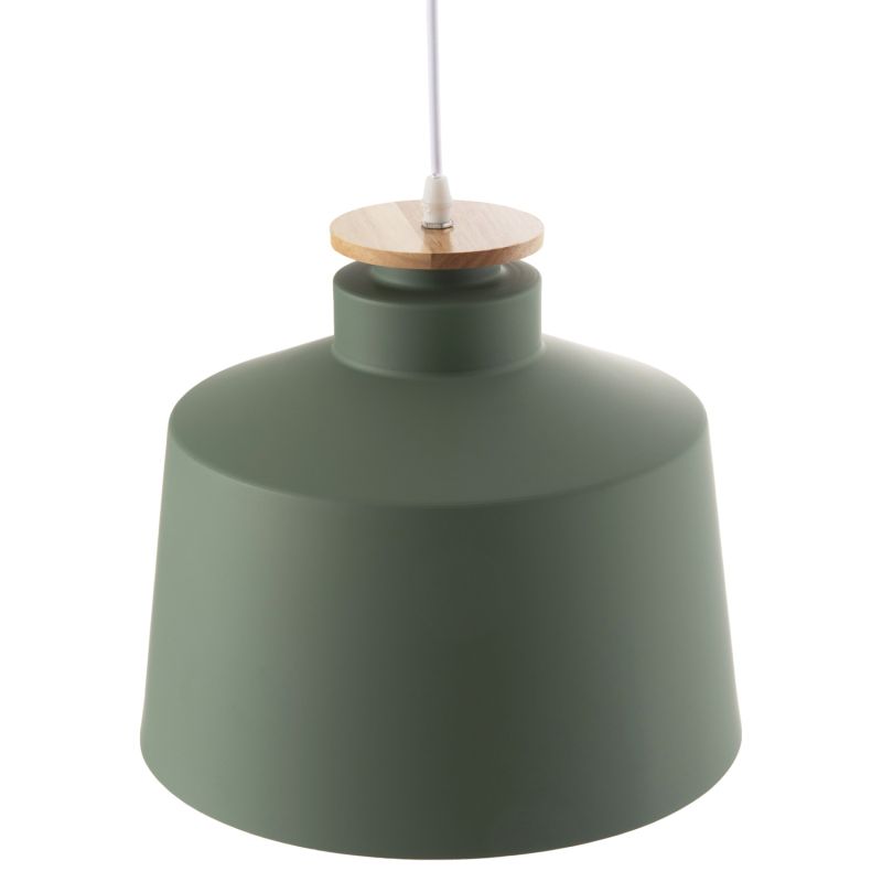 Открийте нашата нова висяща таванна лампа и завършете декорацията си. Това е лампа със ЗЕЛЕНА АЛУМИНИЕВА капачка във формата на камбана с дървени детайли в горната част на лампата. Естетически, той е завършен с бял висящ кабел и бяла таванна основа и е най-новата тенденция при плафониери.