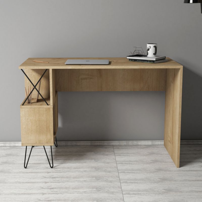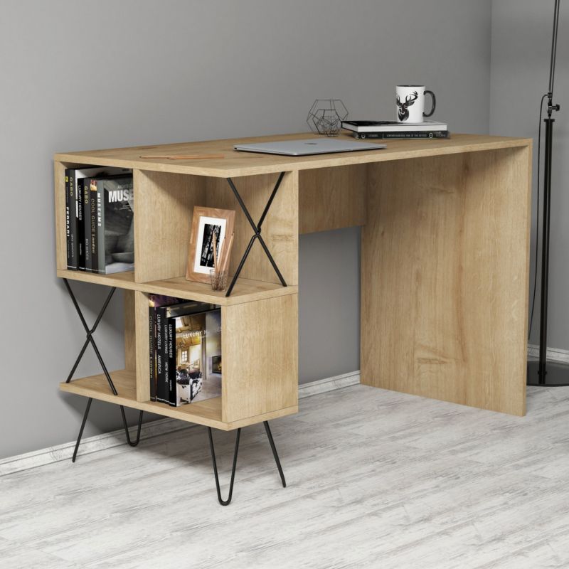 Студията DESK HΜ9509.01 е качествено предложение, предимно за домашния офис. Цветът НАТУРАЛЕН ДЪБ прави мебелите доминиращи в пространството. Отличната и практична конструкция гарантира, че ще се наслаждавате на всичките си работни часове, които знаем, че са много! Все пак бюрото е най-елементарната мебел в стаята и трябва да го избирате внимателно. HΜ9509.03 има 4 отворени пространства за поставяне на обекти във формата на кубчета от лявата страна и разбира се повърхност с добър размер. Дизайнът е модерен, като краката от лявата страна са метални в черен цвят, докато дясната страна се поддържа от меламинов панел.
