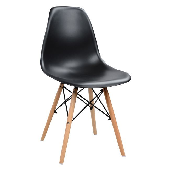 Модерен стол, изработен от дървена конструкция и черна полипропиленова седалка.