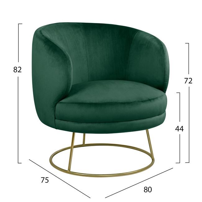 Фотьойл HM8403.03 е модерен и стилен фотьойл, който ще остави своя отпечатък във всеки хол. Кръглата му форма с кръгла метална основа, съчетана с нисък гръб и еднакви по височина ръце, „прегръщат“ тялото и предлагат комфорт и стил. Впечатляващият КИПАРИСНО ЗЕЛЕН цвят със ЗЛАТНА основа може да се комбинира с много други цветове в декорацията на всекидневната.
