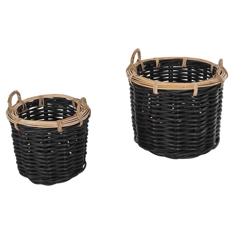 Декоративните подови кошници “POTTS” ще придадат свеж "облик" на вашето външно пространство. Това са 2 различни по големина кошници в ЧЕРЕН цвят, с горен отварящ се кръг в НАТУРАЛЕН цвят. Те са изработени от естествен ратан (CL) и могат да се използват по много различни начини, или като кошници за пренасяне на неща, или като място за съхранение, или дори като саксии.