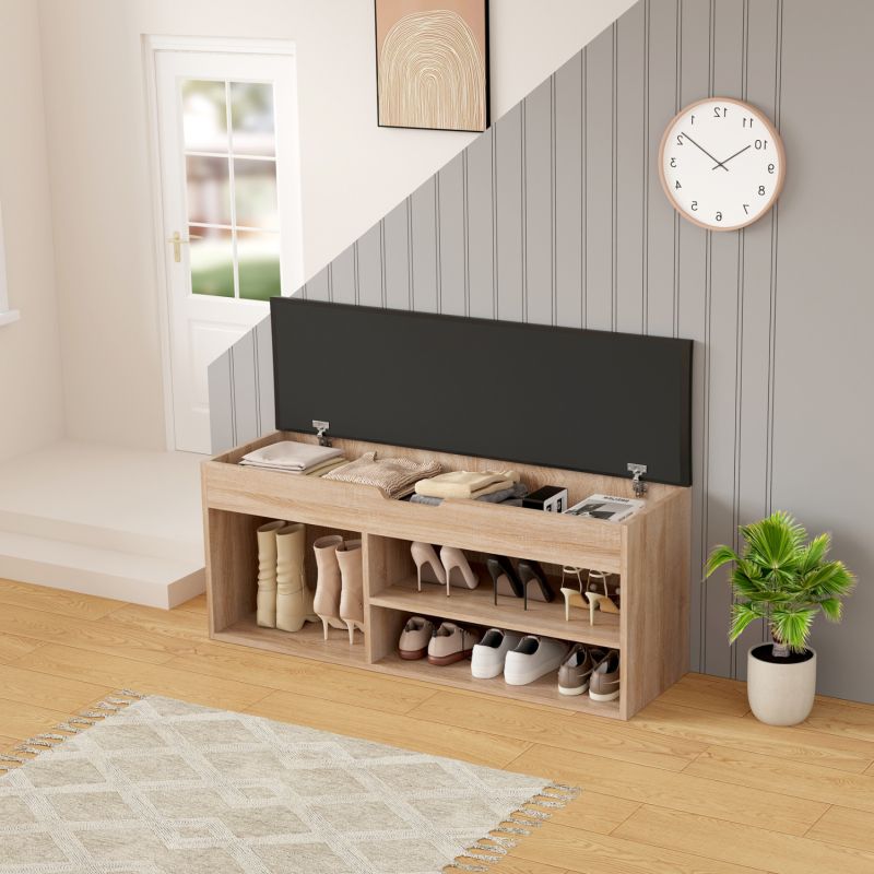 Обичате ли да сте спретнати и чисти? Представяме ви меламинова поставка за обувки ROMIR в цвят SONAMA с много ниски метални крака. Мебел, която освен място за съхранение на обувки има и седалка, покрита с PU кожа в КАФЯВ цвят, за да можете да носите обувките си седнали. Мястото за съхранение е отворено с 2 нива от едната страна и още едно по-високо от другата страна за по-високи обувки, докато под повдигащата се седалка има друго, по-плитко място за съхранение на вещи. Нашата цел е да ви помогнем да организирате и подобрите функционалността на вашия дом по възможно най-добрия начин.