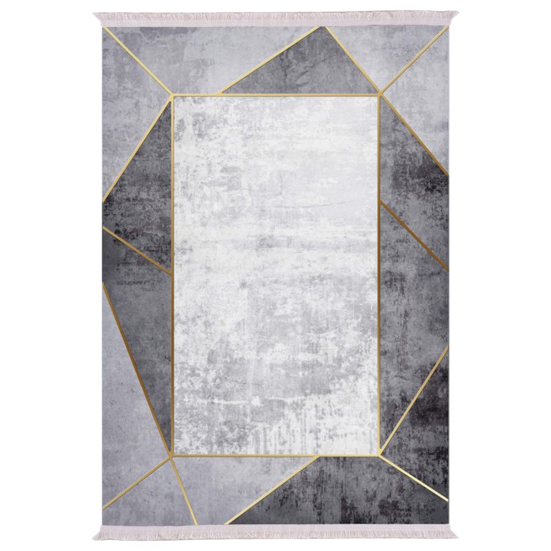 Този модерен килим е с доминиращи цветове бяло, сиво в два тона и златно в линиите. Неговата забележителна характеристика е белият правоъгълник в центъра на килима, който прилича на огледало в златна рамка. Модерен килим, който ще хване окото и ще надгради естетически вашата всекидневна.