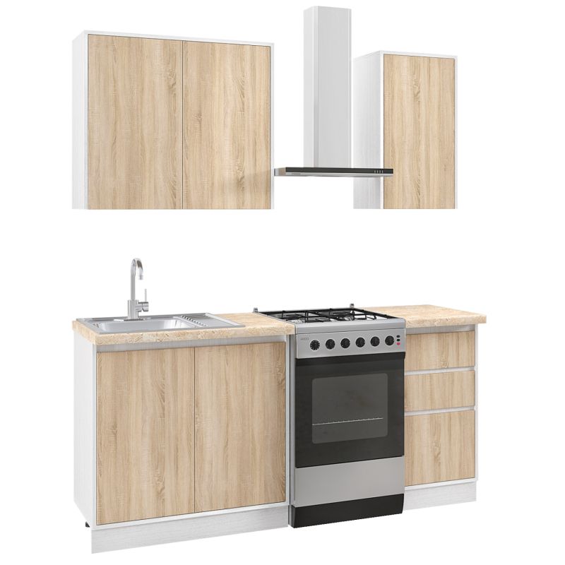 Кухненска композиция--- Представяме ви новата серия мебели-композиции за кухня, които добавихме към нашата гама. Тази меламинова композиция в цвят дъб SONOMA и страни и долна рамка в бяло се състои от 1 голям двоен и 1 единичен стенен шкаф, докато подовият модул се състои от 1 голям двоен шкаф под единичната мивка и скрин с 3 чекмеджета в ъгъл. Кухненските плотове от композицията са в цвят бежов мрамор и създават усещане за монохромност, което придава униформен вид на вашата кухня, а материалът им на изработка ви позволява да ги използвате комфортно, тъй като са устойчиви на различни видове натоварвания.