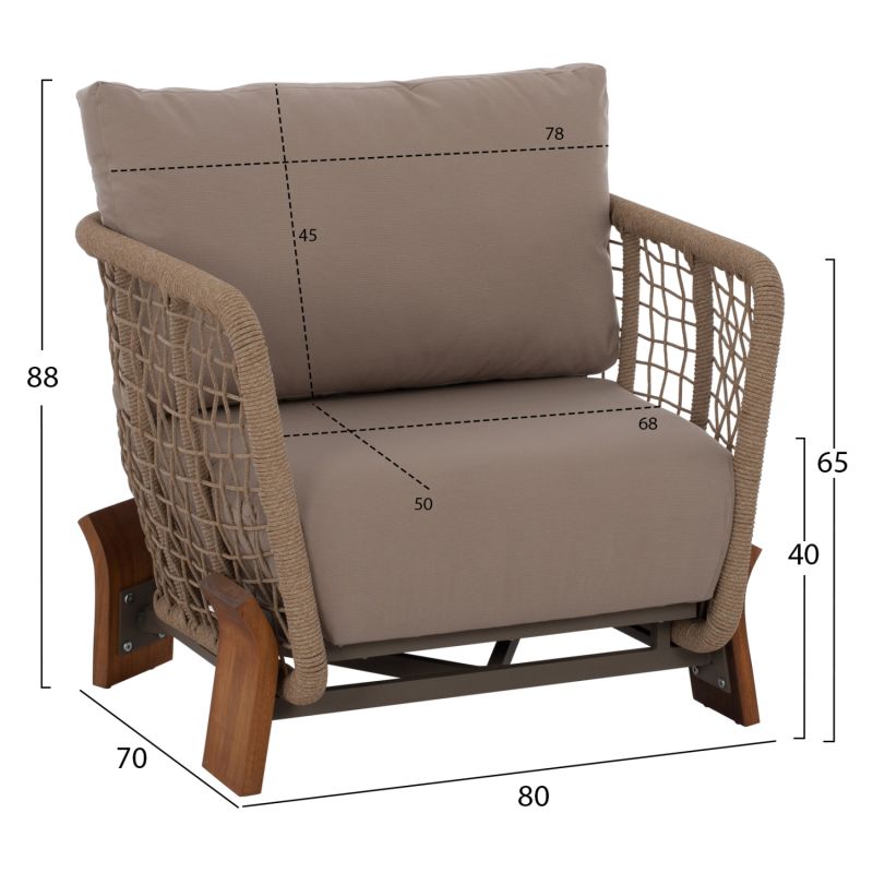 HΜ5884.01--- Представяме ви впечатляващия, нов и ръчно изработен външен комплект с доминиращ цвят БЕЖОВО. Състои се от холна маса, 2 фотьойла и 3-местен диван. Комплект, който ще обикнете от пръв поглед. Красивата маса е с овална форма и повърхност от безопасно стъкло, а основата й е изцяло въже, завързано за алуминиевата й рамка. Фотьойлите са също толкова впечатляващи. Краката им са 4 парчета масивно дърво IROKO, докато въжето на алуминиевата рамка придава еднаквост с масата. Седалката им е широка, а в комбинация с удобните възглавници както на седалката, така и на облегалката предлагат почивка и комфорт. Диванът 3-ка в подобен дизайн също е впечатляващ и допълва комплекта по най-добрия начин. Възглавниците в целия комплект са покрити с качествена дамаска в БЕЖОВ цвят и са с пълнеж от дунапрени със средна твърдост за максимален комфорт. Какво повече може да поиска някой, за да подобри своята градина, балкон или заден двор?