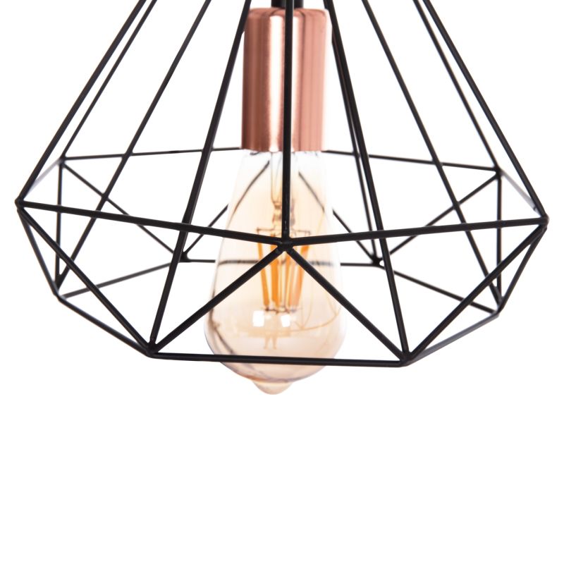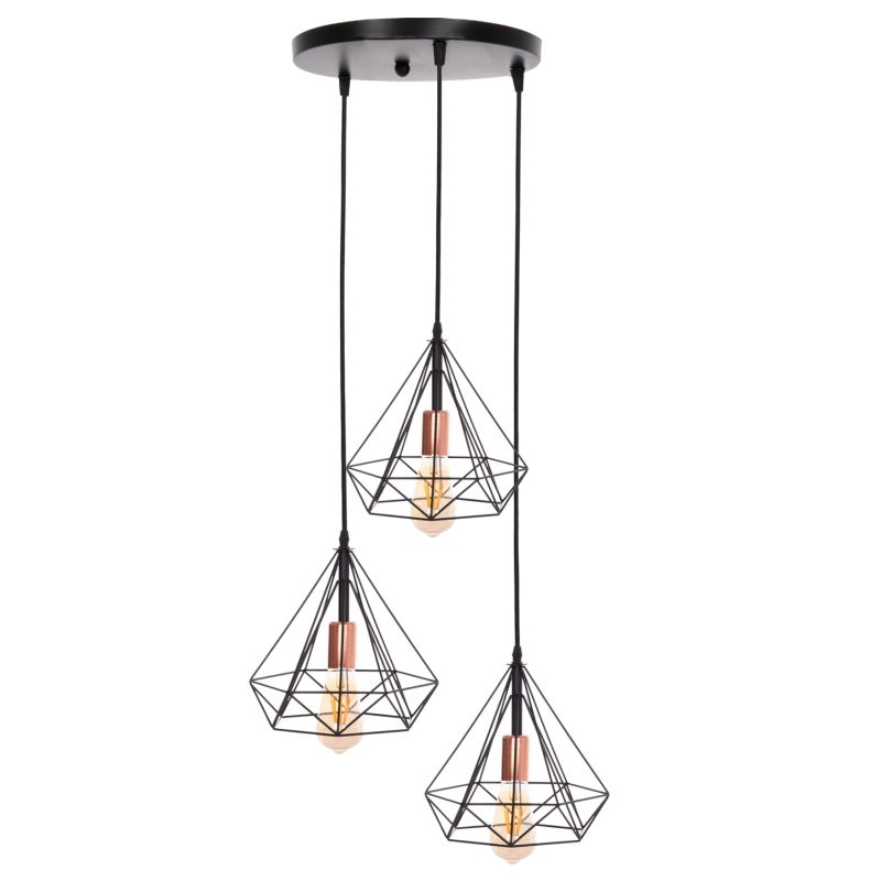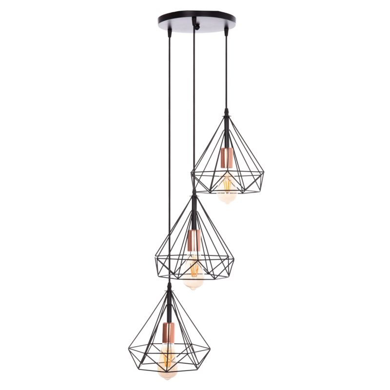 Оставете светлината да се разпространи в пространството с оригинален и елегантен пендел, завършващ вашата декорация. Диамантената форма с ЧЕРНИ метални пръти върху 3-те лампи, разположени на различни височини, е олицетворение на модерния дизайн.