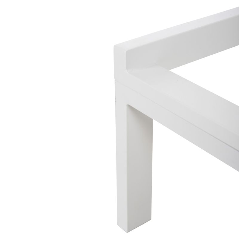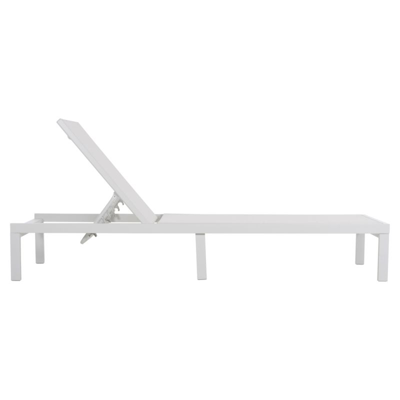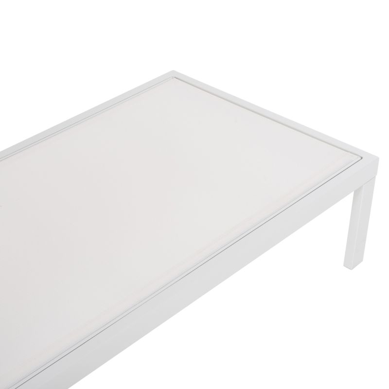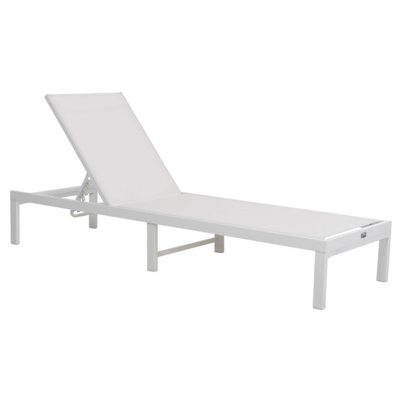 Професионалният плажен шезлонг THATCHER в БЯЛ цвят е красив и луксозен. Изработен е от алуминий и текстил също в БЯЛ цвят и има допълнителни крачета по средата на дължината за още по-голяма здравина. По дизайн неговите "линии" са изчистени и квадратни. Наклоненият „степер“ има 5 нива (включително равна позиция).